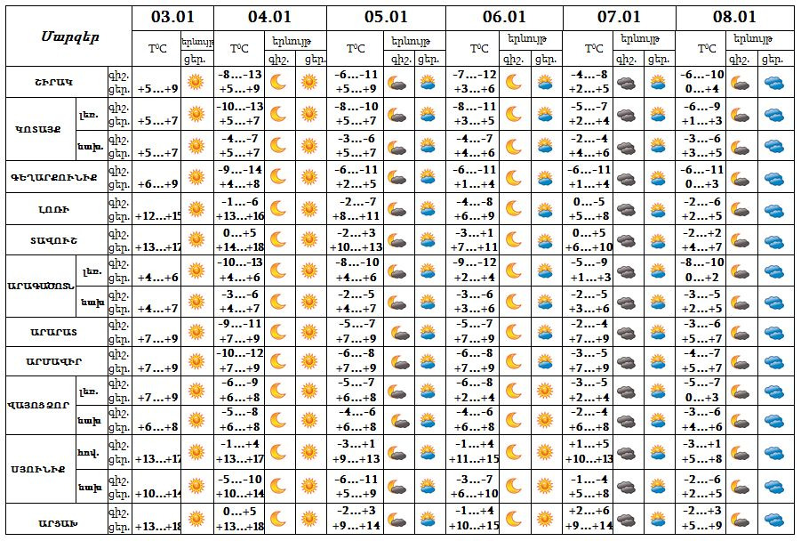 Հունվարի 3-ի ցերեկը, 4-8-ը սպասվում է առանց տեղումների եղանակ: