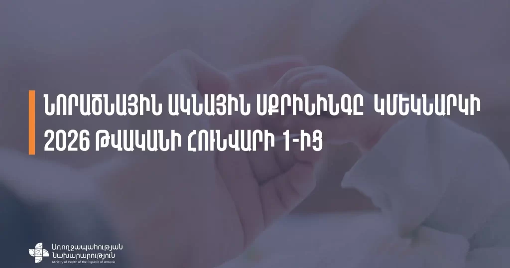 ՀՀ առողջապահության նախարարությունից հայտնում են, որ 2026 թվականի հունվարի 1-ից կմեկնարկի նորածնային ակնային սքրինինգը, որն 8-րդը կլինի մանկական սքրինինգային ծրագերում: