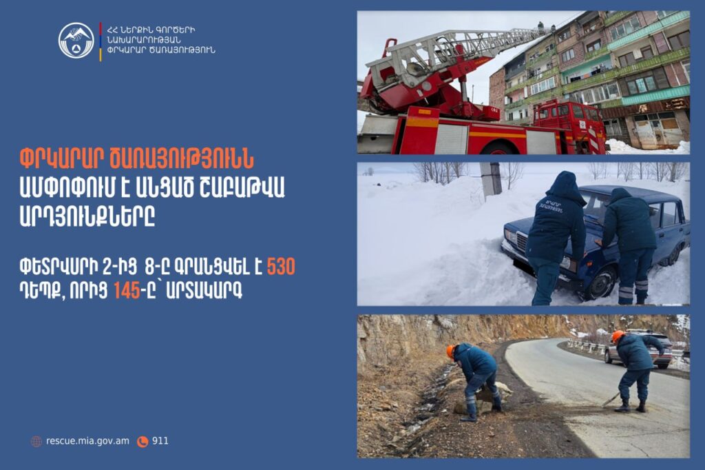 Փետրվարի 2-ից 8-ը ՆԳՆ ՓԾ ճգնաժամային կառավարման ազգային կենտրոնում գրանցվել է 530 դեպք, որից 145-ը՝ արտակարգ: