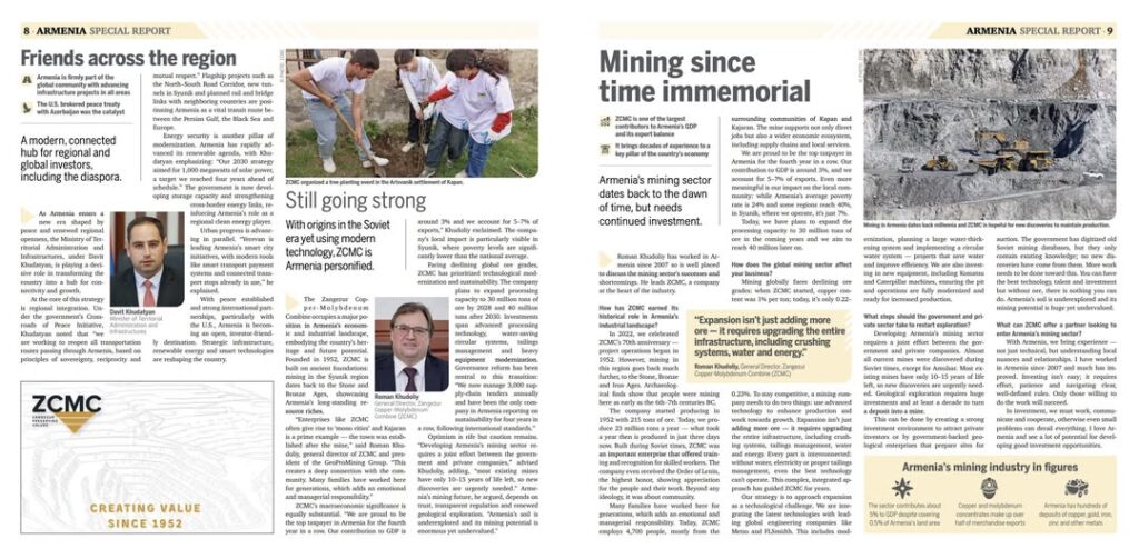 Պարբերականին տված հարցազրույցում ԶՊՄԿ գլխավոր տնօրեն Ռոման Խուդոլին ընդգծել է, որ վերջին 4 տարում ընկերությունը դարձել է Հայաստանի խոշորագույն հարկատուն։ Շեշտվել է, որ ԶՊՄԿ-ի ազդեցությունը ՀՆԱ-ում կազմում է մոտ 3%, իսկ երկրում հանքարդյունաբերության ծավալը՝ 5%, այն դեպքում, երբ ոլորտը զբաղեցնում է ՀՀ տարածքի ընդամենը 0,5%-ը։