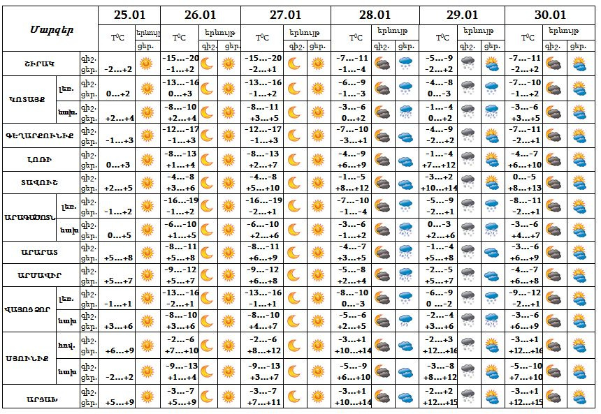 Հունվարի 26-29-ի ցերեկն օդի ջերմաստիճանը Լոռիում, Տավուշում, Սյունիքում և Արցախում կբարձրանա 8-10 աստիճանով: