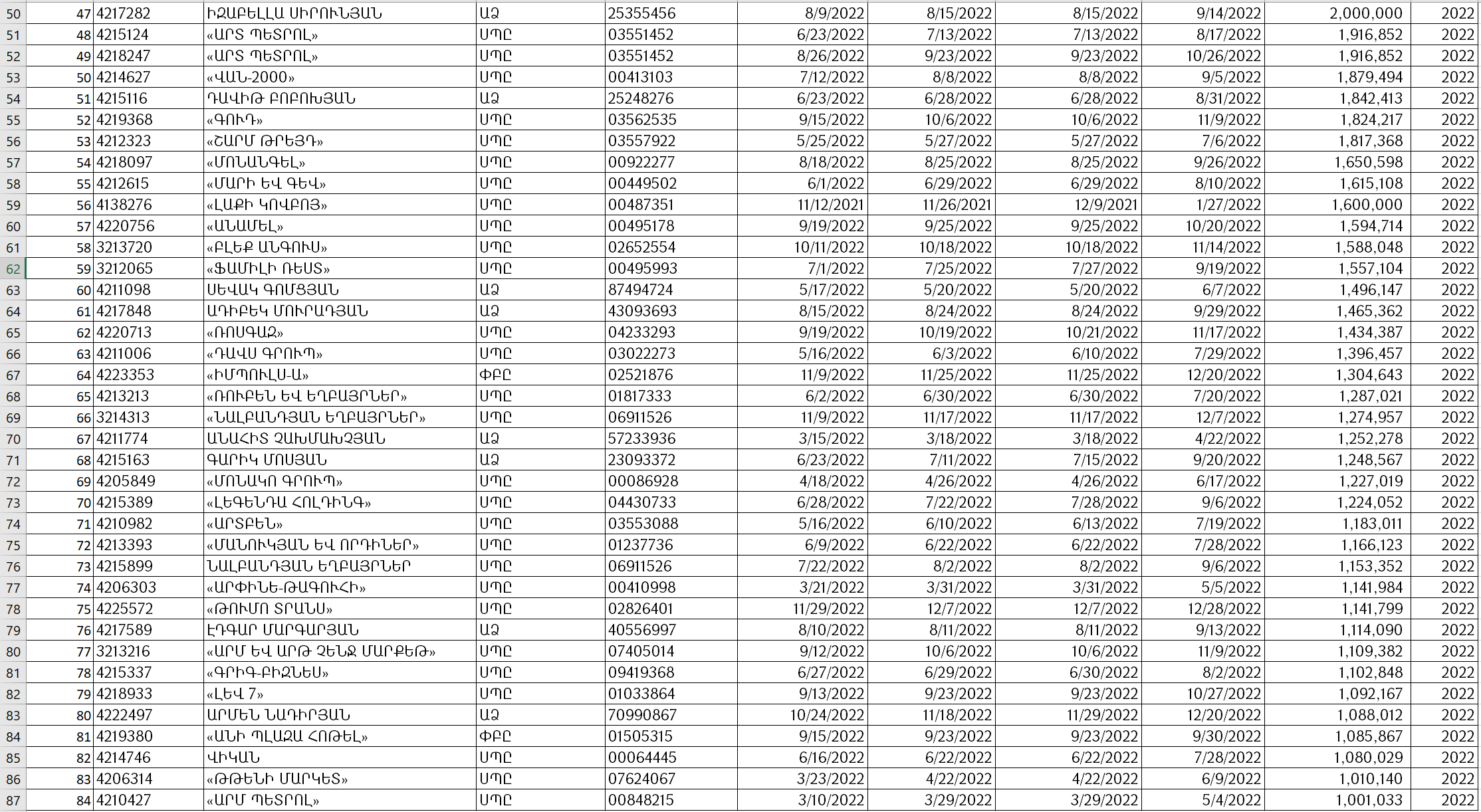 2022 թվականին ավարտված մեկ հսկողական միջոցառման արդյունքում հսկիչ դրամարկղային մեքենաների կանոնների խախտման համար 84 դեպքով հարկ վճարողներին առաջադրվել է 1 մլն դրամից ավելի տուգանք։