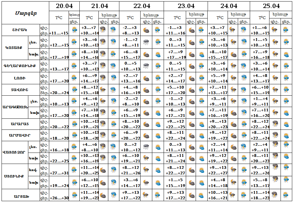 Ապրիլի 21-ին, 24-ին շրջանների զգալի մասում ժամանակ առ ժամանակ, 22-23-ը, 25-ին առանձին շրջաններում սպասվում է անձրև և ամպրոպ, առանձին վայրերում հնարավոր է նաև կարկուտ։