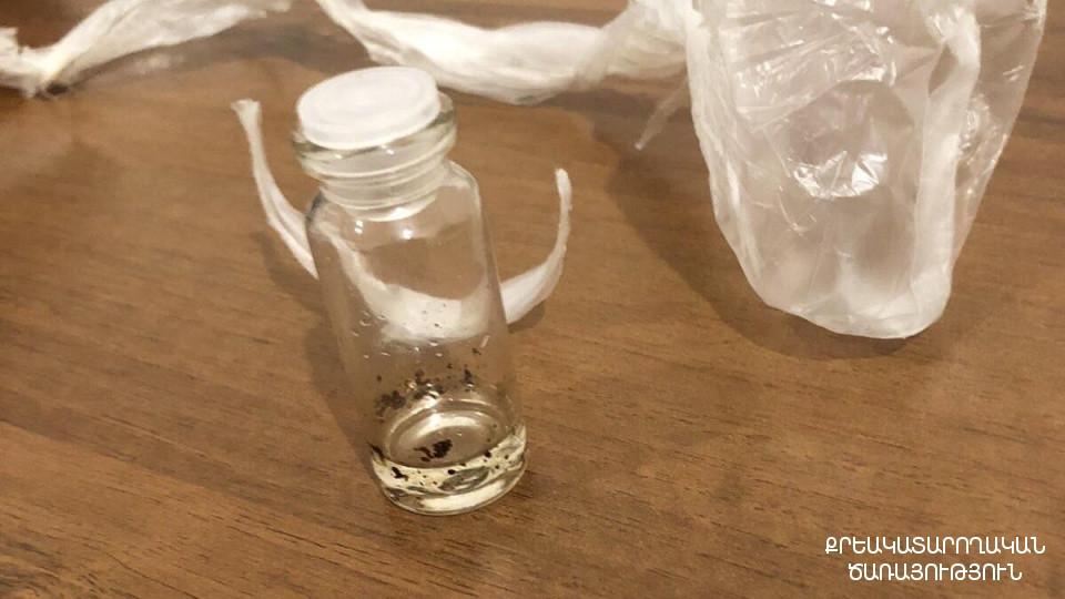 Խուզարկության արդյունքում սայլակի մեջ եղած սննդի տարայից հայտնաբերվել է պոլիէթիլենային թաղանթով փաթեթավորված ապակյա սրվակ՝ թմրանյութին նմանվող հեղուկով: Դատապարտյալ Ն.Խ.-ն բանավոր հայտարարել է, որ սրվակում մեթադոն է: