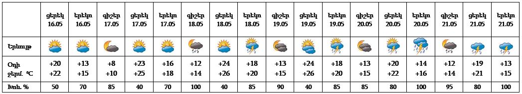Մայիսի 16-ի ցերեկը, 17-ին սպասվում է առանց տեղումների եղանակ։ Մայիսի 18-19-ը հնարավոր է, 20-21-ը սպասվում է կարճատև անձրև և ամպրոպ։ Ամպրոպի ժամանակ՝ քամու ուժգնացում՝ 13-15 մ/վ արագությամբ։