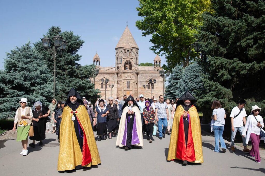 «Առավոտյան Մայր Աթոռ Սուրբ Էջմիածնից եկեղեցականների թափորը հավատացյալների ուղեկցությամբ, Էջմիածնի Հայորդյաց տան սաների թմբուկների զարկերի ներքո, շարժվեց դեպի Սուրբ Հռիփսիմե վանք` տանելով սուրբ Հռիփսիմեի մասունքները: Սուրբ Գրիգոր Լուսավորչի կամարի առջև Ամենայն Հայոց Հայրապետը, սրբազան Աջով օրհնեց հոգևոր դասին և ներկա բարեպաշտ ժողովրդին՝ այն փոխանցելով Մայր Աթոռի Քրիստոնեական դաստիարակության կենտրոնի տնօրեն Հոգեշնորհ Տ․ Զաքարիա ծայրագույն վարդապետ Բաղումյանին։