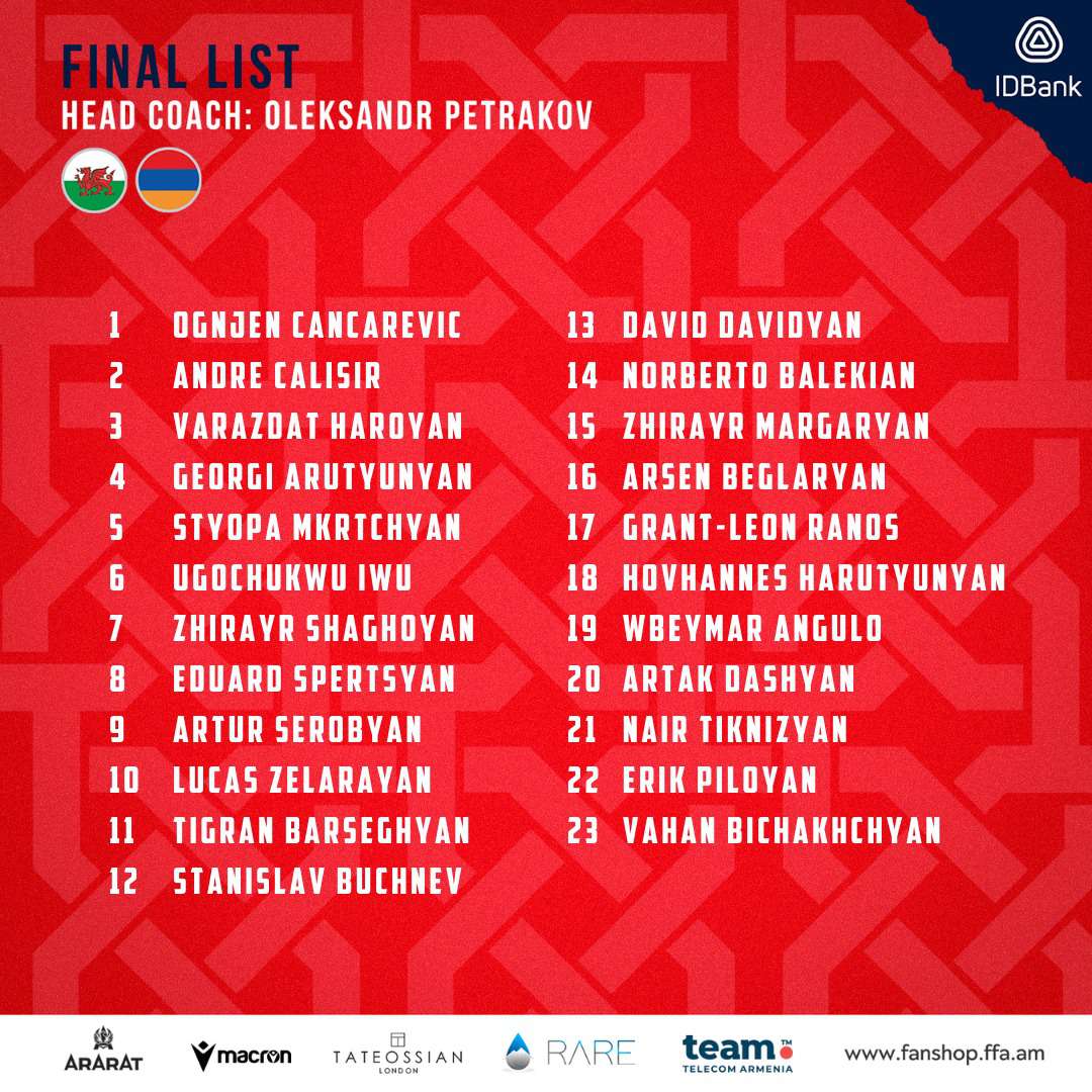 Հրապարակվել է Հայաստանի ազգային հավաքականի վերջնական հայտացուցակը Ուելսի դեմ խաղում։ Այս մասին հաղորդում են ՀՖՖ-ից։