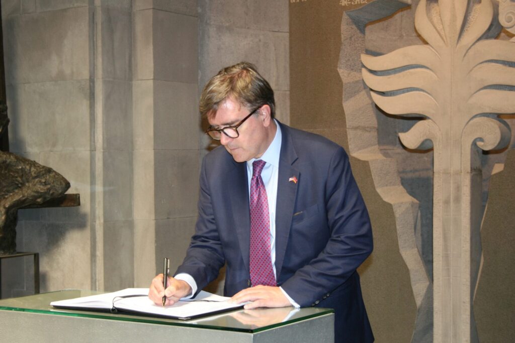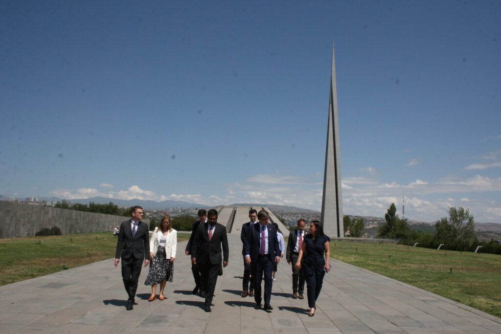 Հյուրերը շրջել են նաև Հայոց ցեղասպանության թանգարանում, որտեղ ՀՑԹԻ գիտական աշխատանքների գծով փոխտնօրեն Էդիտա Գզոյանի ուղեկցությամբ ծանոթացել են մշտական և ժամանակավոր ցուցադրություններին, որից հետո պարոն Ջեյմս Օ՛Բրայենը գրառում է կատարել Պատվավոր հյուրերի հուշամատյանում: