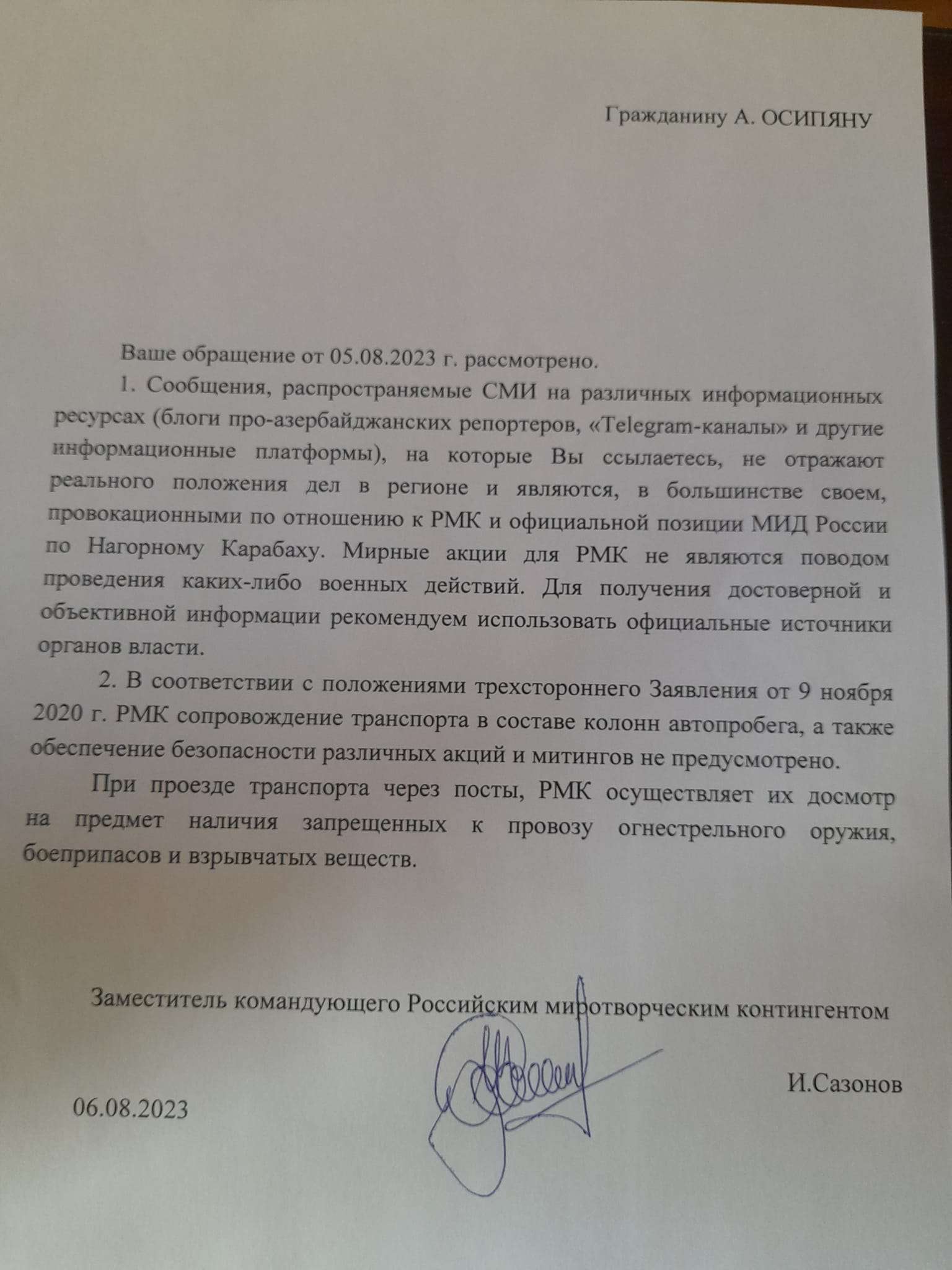 «2020թ. նոյեմբերի 9-ի եռակողմ հայտարարության դրույթների համաձայն՝ ռուսական խաղաղապահ զորախմբի համար նախատեսված չէ, որ ավտոերթի շարասյուններում մեքենաների ուղեկցի, ինչպես նաև տարբեր ակցիաների ու հանրահավաքների անվտանգությունն ապահովի»,- ասված է ՌԴ խաղաղապահ զորախմբի ղեկավարի տեղակալ Սոզոնովի նամակում։