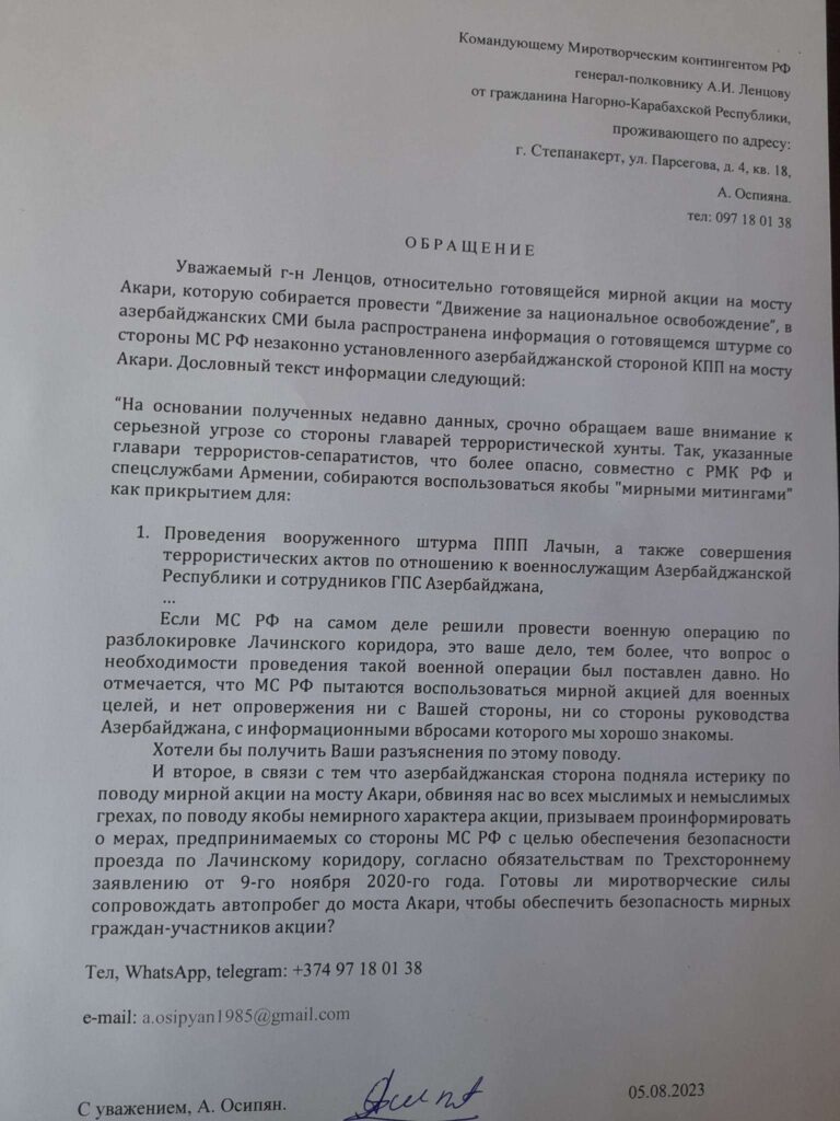 Ռուս խաղաղապահ զորախմբի հրամանատարությունը հրաժարվել է ուղեկցել արցախցիների ավտոերթը դեպի Հակարիի կամուրջ։ Այս մասին «ֆեյսբուքում» գրառում է կատարել Արցախի «Հեղափոխական» կուսակցության առաջնորդ Արթուր Օսիպյանը՝ հրապարակելով ՌԴ խաղաղապահ զորախմբի հրամանատարությունից ստացված նամակը։