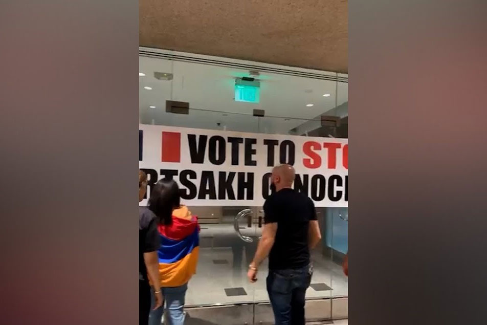 Լոս Անջելեսում ապրող հայերն ակցիա են կազմակերպել Ֆրանսիայի հյուպատոսության մոտ։ Նրանք մուտքի մոտ փակցրել են պաստառ՝ Արցախում ցեղասպանությունը կանգնեցնելու պահանջով։