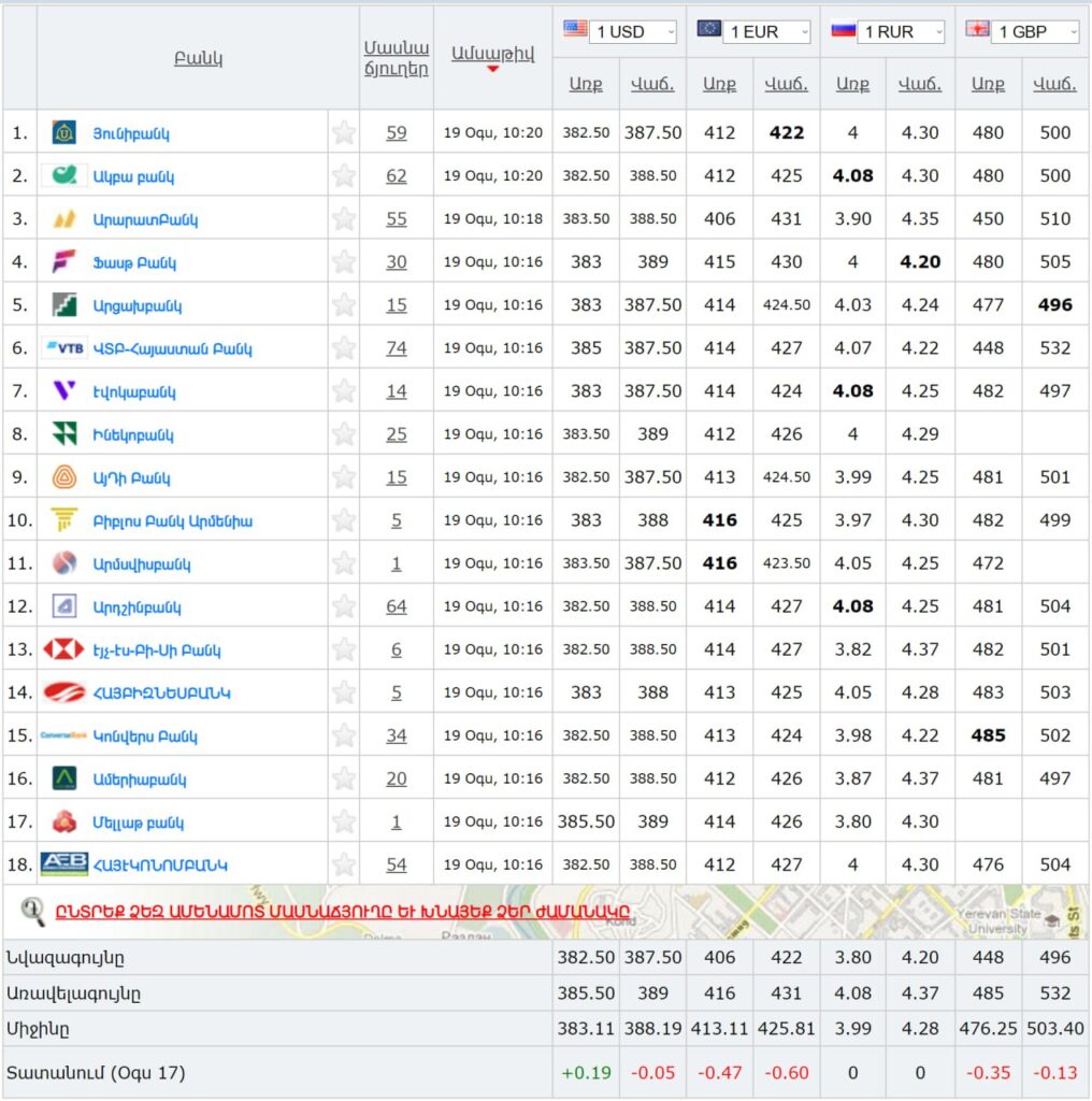 Մեկ դոլարը գնվում է 382.50 դրամ նվազագույն և 385.50 դրամ առավելագույն փոխարժեքով, վաճառվում՝ 387.50 դրամ նվազագույն և 389 դրամ առավելագույն փոխարժեքով: