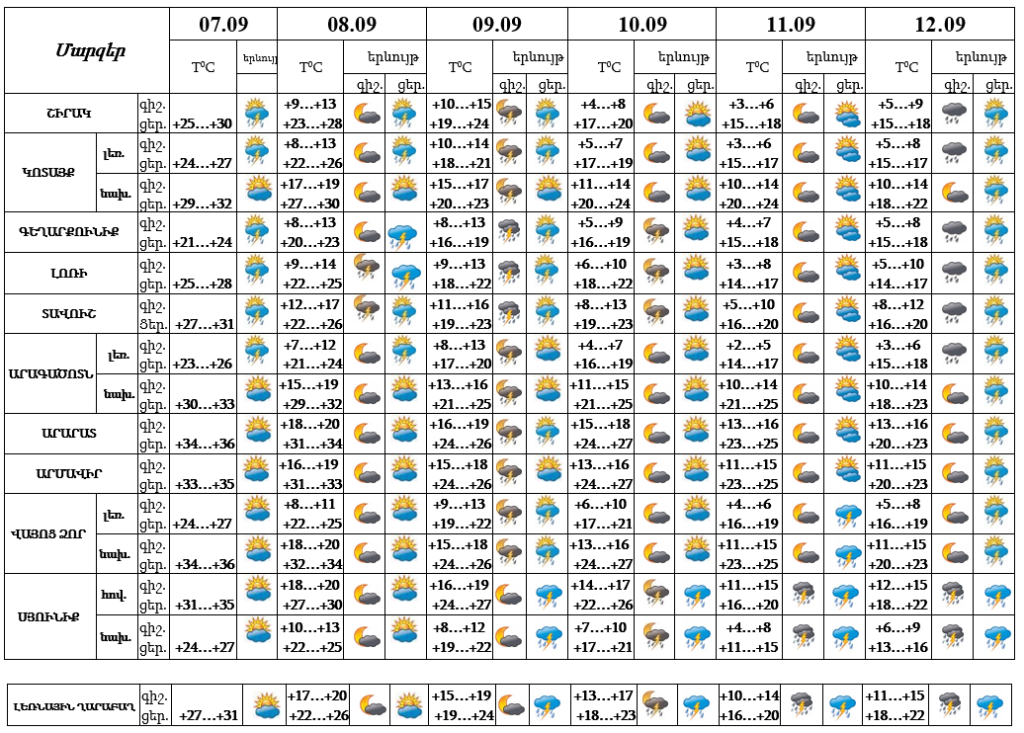 Օդի ջերմաստիճանը սեպտեմբերի 7-12-ին աստիճանաբար կնվազի 8-12 աստիճանով։