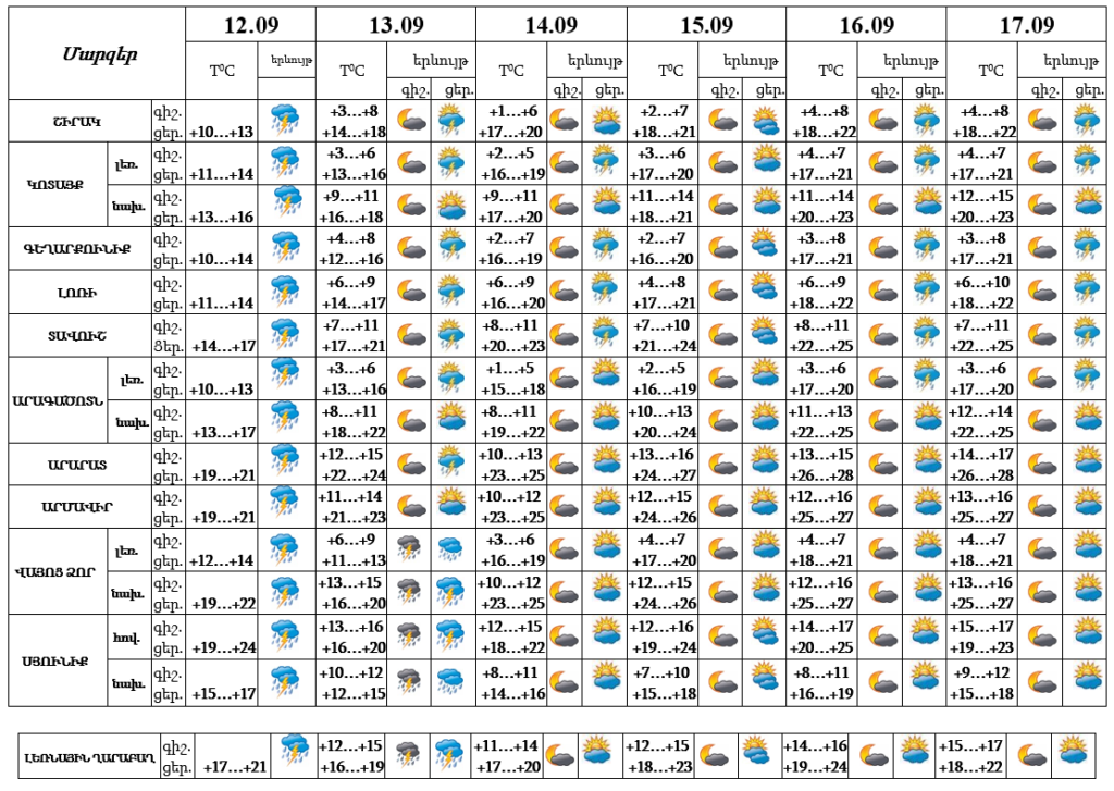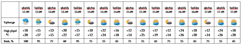Սեպտեմբերի 12-ի ցերեկը, 13-ին կեսօրից հետո սպասվում է անձրև և ամպրոպ, ամպրոպի ժամանակ նաև քամու ուժգնացում՝ 17-20մ/վրկ արագությամբ։ Սեպտեմբերի 14-17-ին սպասվում է առանց տեղումների եղանակ։