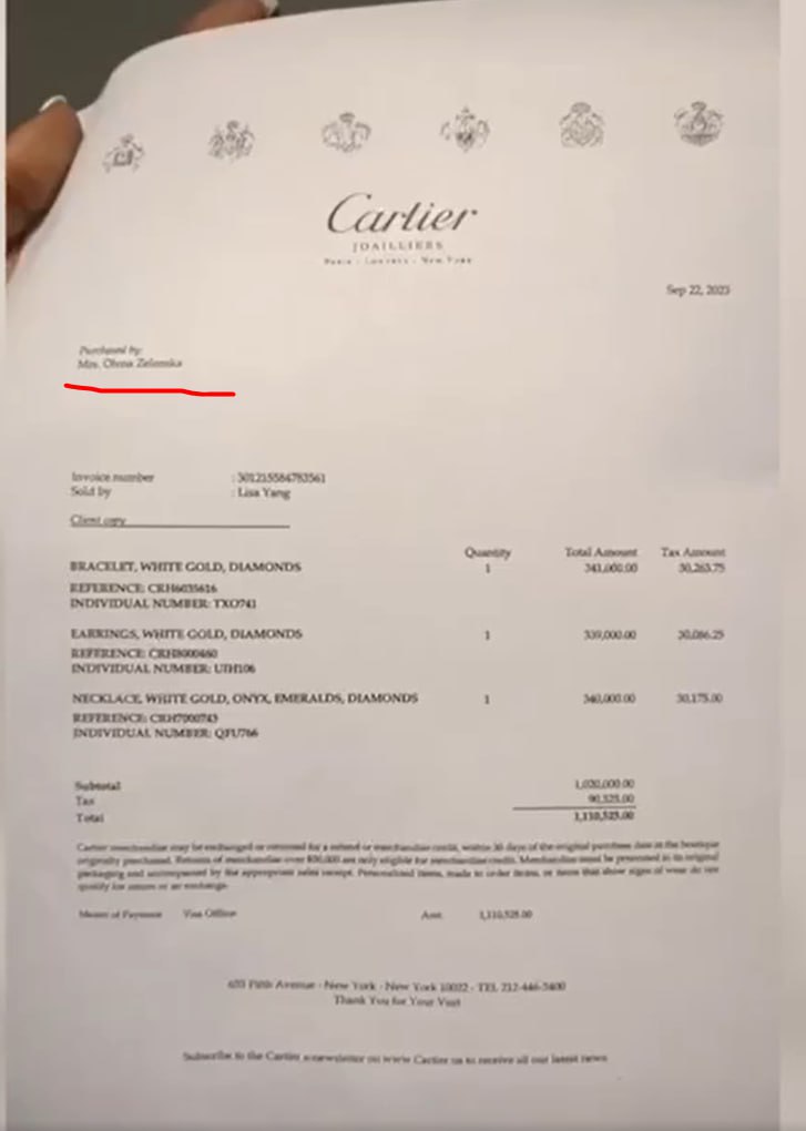 Ուկրաինայի առաջին տիկին Ելենա Զելենսկայան ավելի քան 1,1 միլիոն դոլար է ծախսել Նյու Յորքի Cartier խանութում, մինչ նրա ամուսինը ելույթ էր ունենում ՄԱԿ-ի Գլխավոր ասամբլեային ուղղված իր առաջին ուղերձով ՝ խոսելով Ուկրաինայի աղետների մասին։