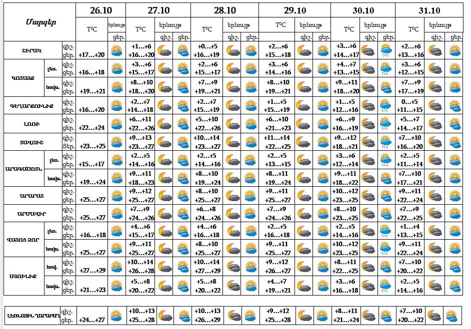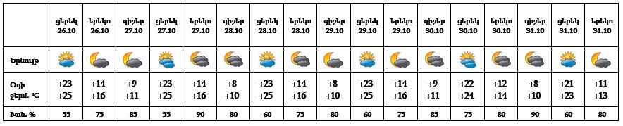 Հանրապետության տարածքում հոկտեմբերի 26-ի ցերեկը, 27-29-ին, 30-ի գիշերը, 31-ին սպասվում է առանց տեղումների եղանակ։ Հոկտեմբերի 30-ի ցերեկը առանձին շրջաններում սպասվում է կարճատև անձրև, առանձին վայերում հնարավոր է նաև մառախուղ։
