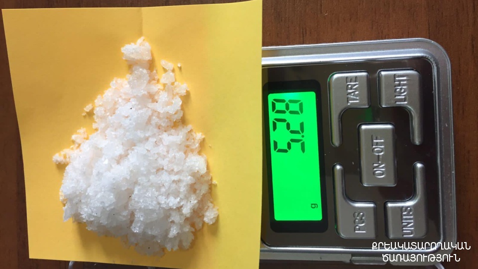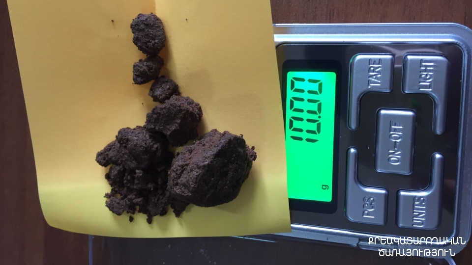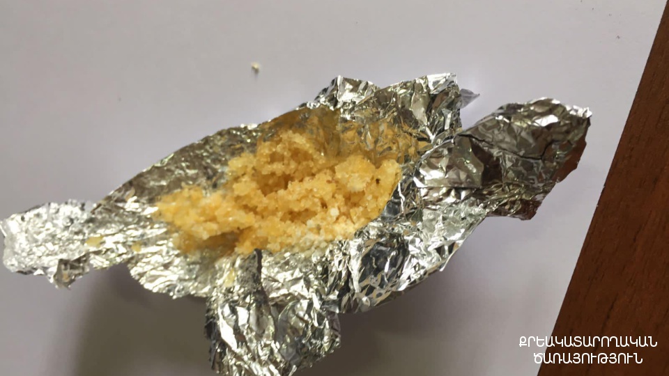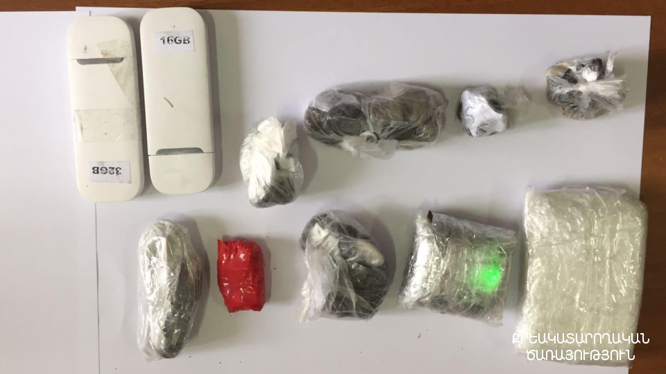Փաթեթից հայտնաբերվել է սև պատյան, որին կցված է եղել կարմիր, կպչուն ժապավենով փաթեթ։ Պատյանի մեջ և կցված փաթեթում առկա են եղել առանձնացված զանգվածներ՝ ընդհանուր 65,63 գրամ քաշով, որոնցից 35,35 գրամը՝ հերոին տեսակի թմրամիջոցին նմանվող զանգված, իսկ 30,28 գրամը՝ «կրիստալ» տեսակի թմրամիջոցին նմանվող զանգված: Բացի այդ՝ պատյանում եղել են նաև 3 wi-fi սարք և ականջակալ: