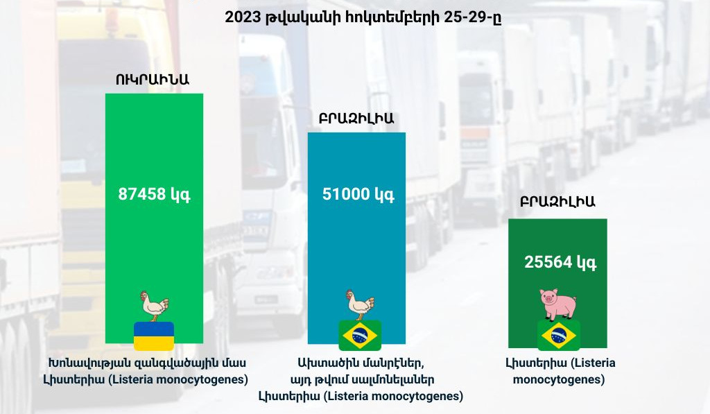 Բրազիլիայից թռչնամիս՝ 51000 կգ, ախտածին մանրէներ, այդ թվում սալմոնելաներ և լիստերիա (Listeria monocytogenes) ցուցանիշներով։