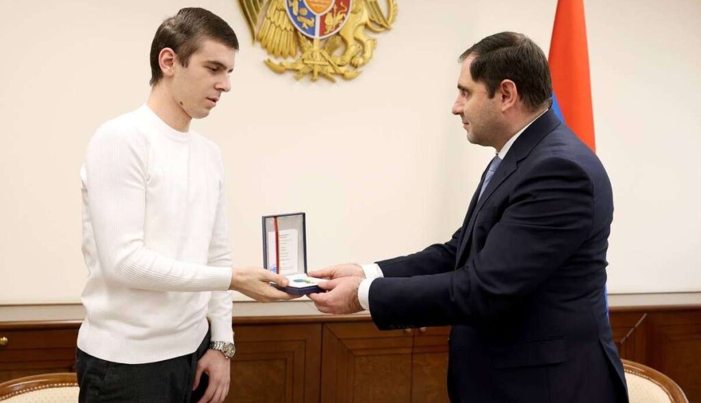 Նախարար Պապիկյանը բարձր է գնահատել նրա արարքը հայրենիքի սահմանների պաշտպանության գործում և հանձնել պետական պարգևը՝ Արիության մեդալը։