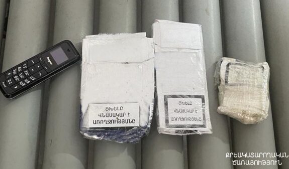 Արդյունքում՝ վերջինիս հագի կոշիկների միջից հայտնաբերվել են 3 ծխախոտի տուփ, իսկ պայուսակից՝ բջջային հեռախոս։