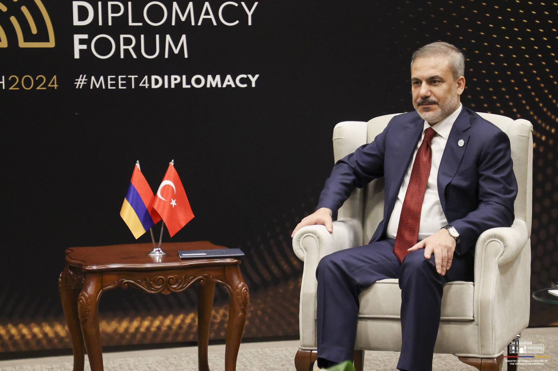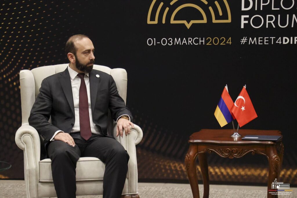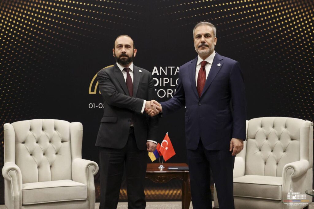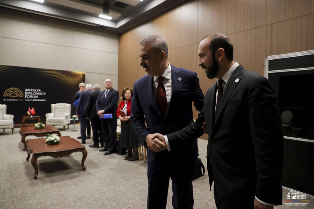 Մարտի 1-ին Անթալիայի դիվանագիտական ֆորումի շրջանակներում Հայաստանի Հանրապետության արտաքին գործերի նախարար Արարատ Միրզոյանը հանդիպում է ունեցել Թուրքիայի Հանրապետության արտաքին գործերի նախարար Հաքան Ֆիդանի հետ: Հանդիպմանը մասնակցել են նաև երկու երկրների միջև հարաբերությունների կարգավորման հարցերով հատուկ ներկայացուցիչները։