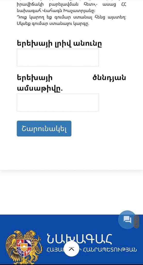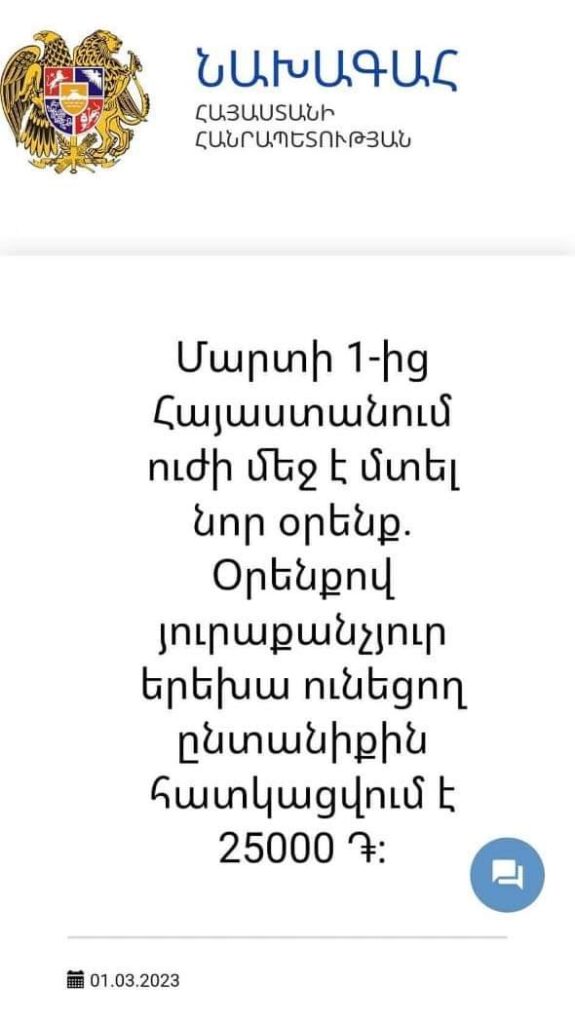 «Facebook սոցիալական ցանցի տարբեր խմբերում կեղծ տեղեկություն է տարածվում՝ իբր մարտի 1-ից Հայաստանում ուժի մեջ է մտել նոր օրենք, համաձայն որի՝ երեխա ունեցող յուրաքանչյուր ընտանիքի հատկացվում է միանվագ 25 000 դրամ աջակցություն։