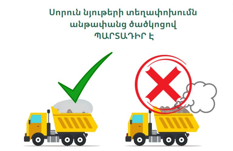 Իրազեկում՝ ավտոտրանսպորտային միջոցներով շինարարական նյութերի և աղբի տեղափոխման ժամանակ մթնոլորտային օդի պահպանության պահանջների չկատարումն առաջացնում է տուգանքի նշանակում ֆիզիկական անձանց նկատմամբ` 50.000 դրամի չափով, իսկ իրավաբանական անձանց նկատմամբ` 150.000 դրամի չափով։