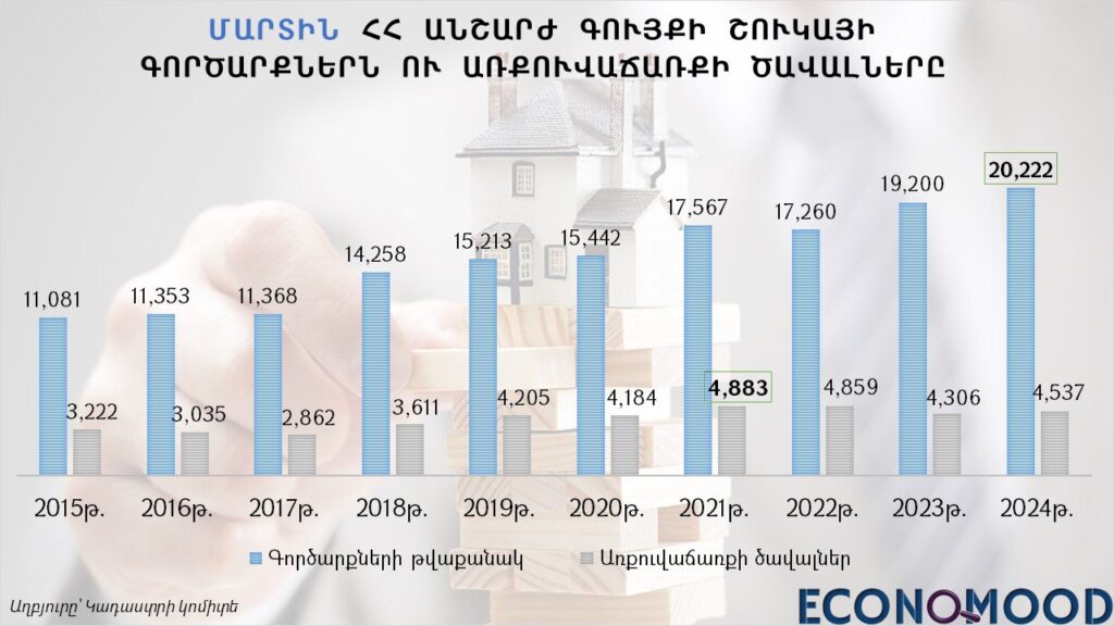 Ընթացիկ տարվա մարտին ՀՀ անշարժ գույքի շուկայում իրականացվել է 20 հազար 222 գործարք, որը նախորդ տարվա նույն ամսվա համեմատ աճել է 5․3%-ով, մինչդեռ նախորդ ամսվա համեմատ՝ նվազել 4․4%-ով: