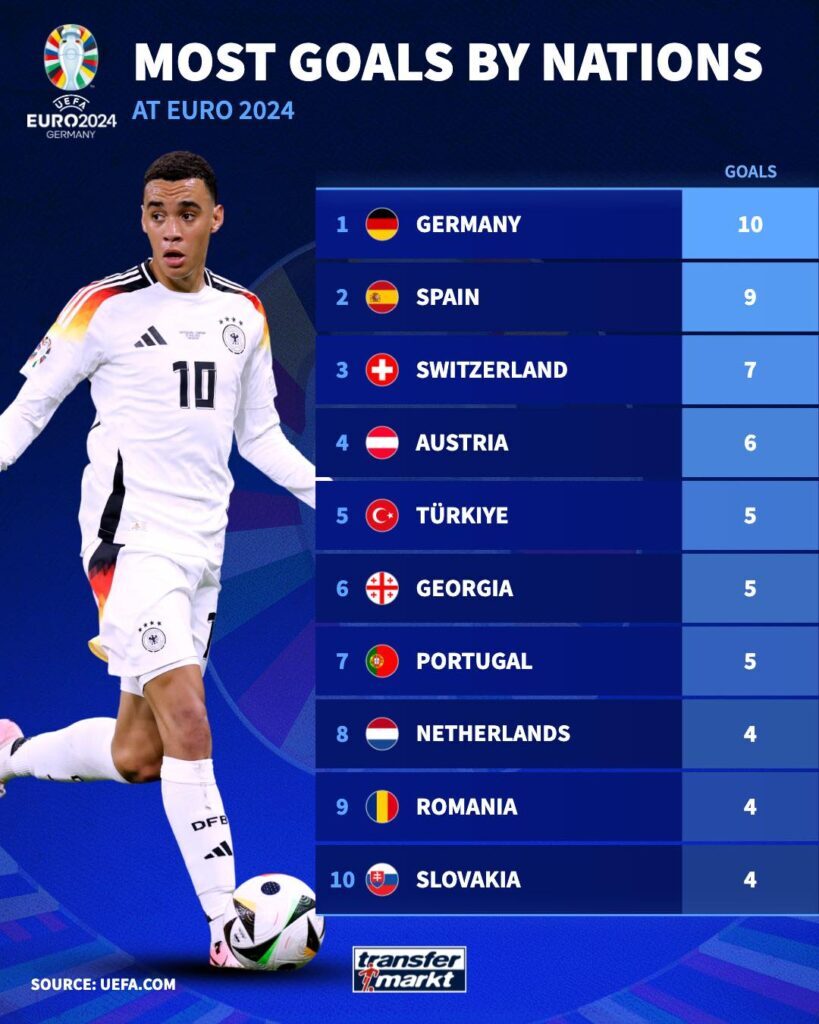 Transfermarket-ը ներկայացրել է Գերմանիայում ԵՎՐՈ-2024-ի ընթացքում ամենաշատ գոլ խփած հավաքականների տասնյակը։