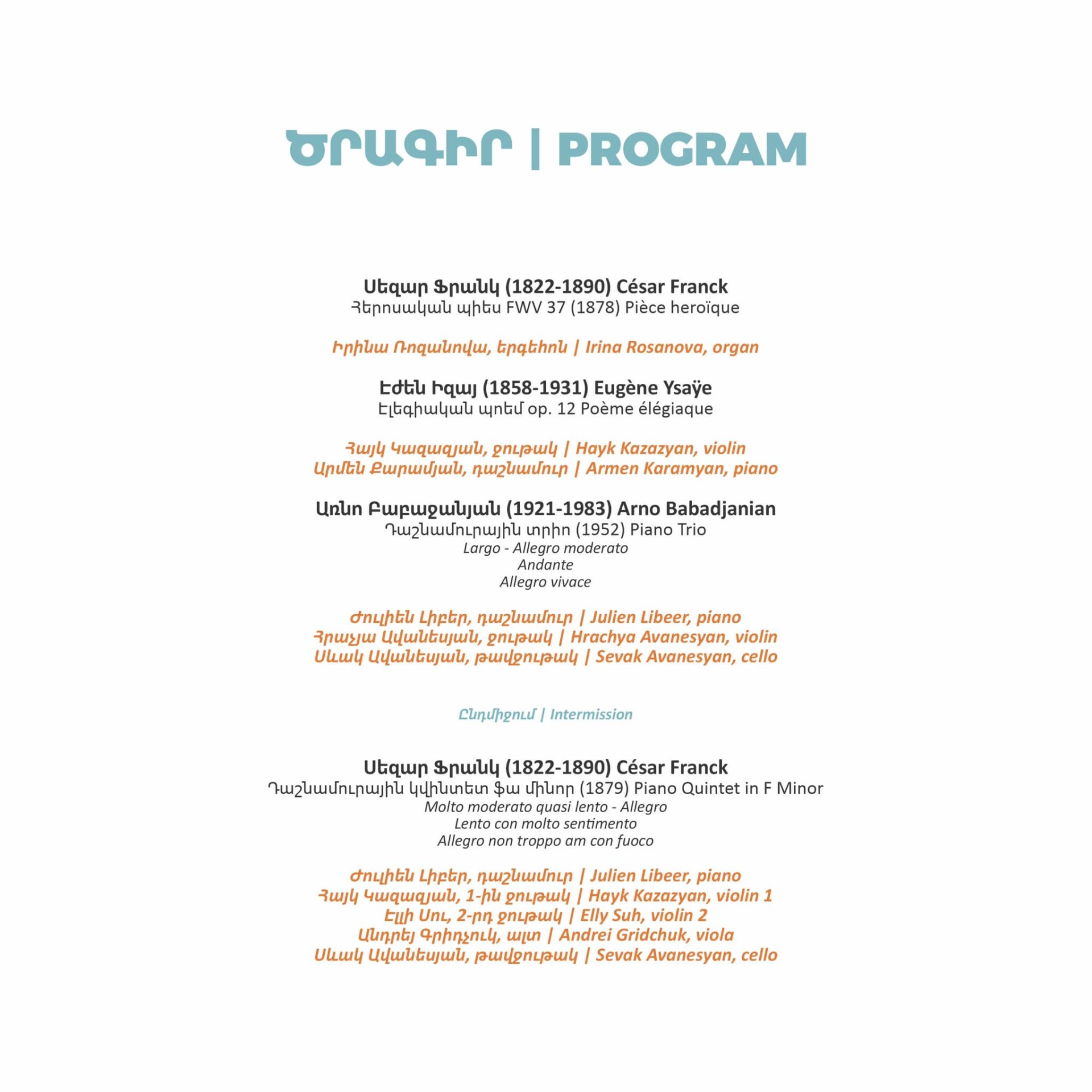 Հուլիսի 6-ին՝ փառատոնի երրորդ օրը, Վահագն Ստամբոլցյանի անվան երգեհոնային դահլիճի բեմում կհնչեն հայազգի երաժշտական լեգենդի՝ Առնո Բաբաջանյանի և բելգիացի տաղանդավոր կոմպոզիտորներ Սեզար Ֆրանկի ու Էժեն Իզայի ստեղծագործությունները: