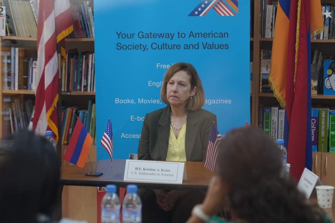 «Կապանում դեսպան Քվինը հանդիպեց Լեռնային Ղարաբաղից տեղահանված անձանց՝ լսելու նրանց ընթացիկ կարիքների մասին և տեղեկանալու իրենց նոր հանգրվաններում Հայաստանի կառավարության և ԱՄՆ ՄԶԳ-ի կողմից ցուցաբերված աջակցության մասին»։