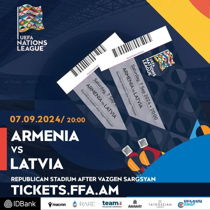 Մեկնարկել է ֆուտբոլի ՈՒԵՖԱ Ազգերի լիգայի առաջին տուրի Հայաստան – Լատվիա հանդիպման տոմսերի առցանց վաճառքը tickets.ffa.am-ում։