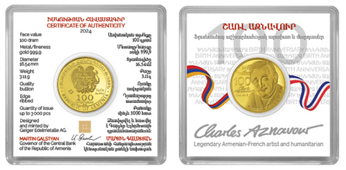 «Ս.թ. օգոստոսի 26-ին ՀՀ կենտրոնական բանկի «Դրամագետ» վաճառասրահից ցանկացողները կարող են ձեռք բերել «Շառլ Ազնավուր-100» ոսկե հուշադրամներ երկու քաշային տարբերակներով՝ 3,11 գրամ (1/10 ունցիա) և 31,1 գրամ (1 ունցիա), ինչպես նաև «Նոյյան տապան» ոսկե ներդրումային դրամներ չորս քաշային տարբերակներով՝ 1 գրամ, 7,78 գրամ (¼ ունցիա), 15,55 գրամ (½ ունցիա) և 31,1 գրամ (1 ունցիա):