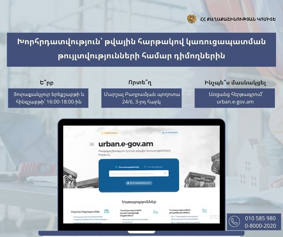 Խորհրդատվական հանդիպումների ժամանակացույցին ծանոթանալու և մասնակցելու համար անհրաժեշտ է նախապես գրանցվել urban.e-gov.am հարթակի «Առցանց հերթագրումներ» դաշտում ստեղծված բաժնում (https://urban.e-gov.am/hy/service/permits_online_booking/info)։