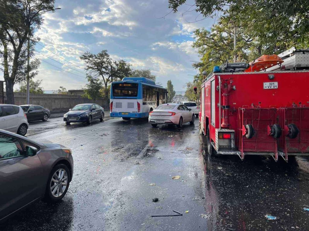 Պարզվել է, որ Բագրատունյաց 81/1 հասցեի մոտակայքում բախվել են «Zhongtong» մակնիշի ավտոբուսը և «Mercedes-Benz» մակնիշի ավտոմեքենան, վերջինից տեղի է ունեցել վառելիքի արտահոսք։