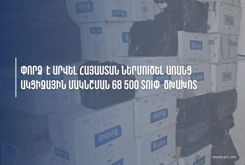 Իրավախախտման անմիջական օբյեկտ հանդիսացող 68.500 տուփ ծխախոտը և բեռնատար ավտոմեքենան վերցվել և ի պահ են հանձնվել «Ագարակ» մաքսային անցման կետում: Ռ․Հ․-ն ձերբակալվել և ՀՀ քրեական օրենսգրքի 290-րդ հոդվածով նախատեսված հանցագործության հատկանիշներով կազմված նյութերի հետ միասին ներկայացվել է ՀՀ քննչական կոմիտեի Սյունիքի մարզային քննչական վարչություն»,- ասված է ՊԵԿ հաղորդագրության մեջ։