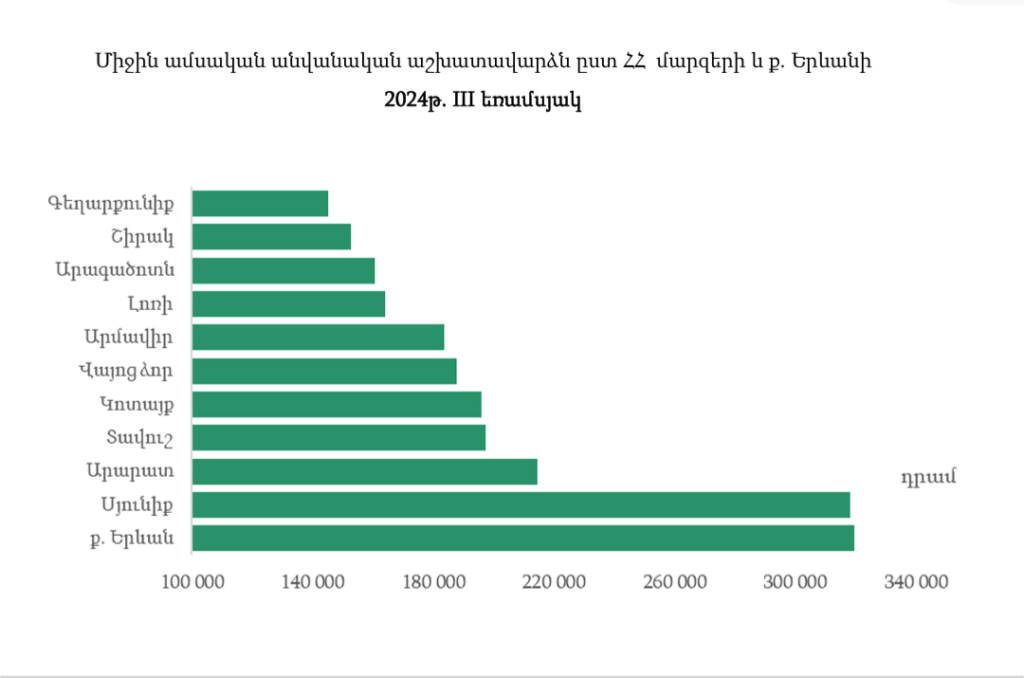 ՀՀ վիճակագրական կոմիտեի 2024 թվականի երրորդ եռամսյակի տվյալներով Հայաստանի մարզերում և Երևանում միջին աշխատավարձերը զգալիորեն տարբերվում են միմյանցից։ Ամենաբարձր աշխատավարձերը գրանցվել են մայրաքաղաքում՝ միջինում 319,889 դրամ, որը երկրի միջին ցուցանիշը գերազանցում է 13.2%-ով։