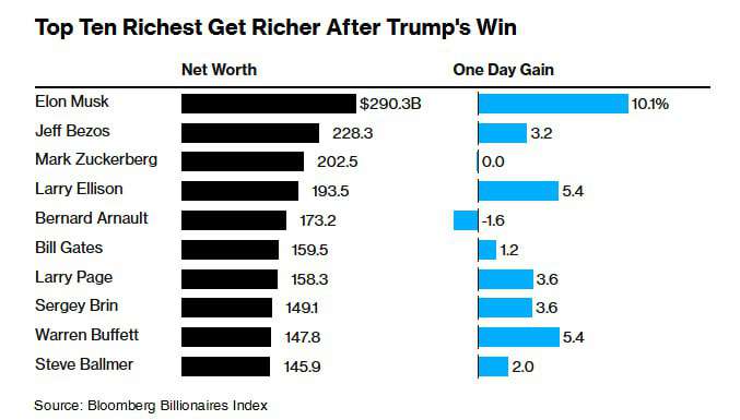 Դոնալդ Թրամփի հաղթանակի արդյունքում աշխարհի 10 ամենահարուստ մարդկանցից ութը միասին հարստացել են ևս 64 միլիարդ դոլարով: Ամենաշատ օգուտը ստացել է Թրամփի հավատարիմ աջակից Իլոն Մասկը․ գրում է Bloomberg-ը։