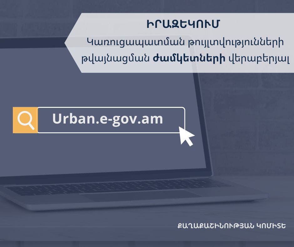 2025թ․ հունվարի 1-ից Հայաստանի ողջ տարածքում էլեկտրոնային եղանակով քաղաքաշինական փաստաթղթերի տրամադրման գործընթացով պայմանավորված՝ Քաղաքաշինության կոմիտեն հստակեցնում է դիմումների ներկայացման ժամկետները։