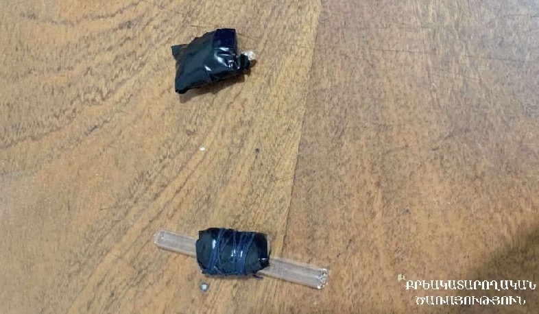 Խուզարկության արդյունքում ծառայողները Ռ․Ն․-ի ներքնազգեստից հայտնաբերել են 2 փաթեթ, որոնցից մեկին թելով ամրացված է եղել ապակե կաթոցիչ։ Ըստ քաղաքացու բանավոր հայտարարության՝ փաթեթներում մարիխուանա տեսակի թմրամիջոց է։
