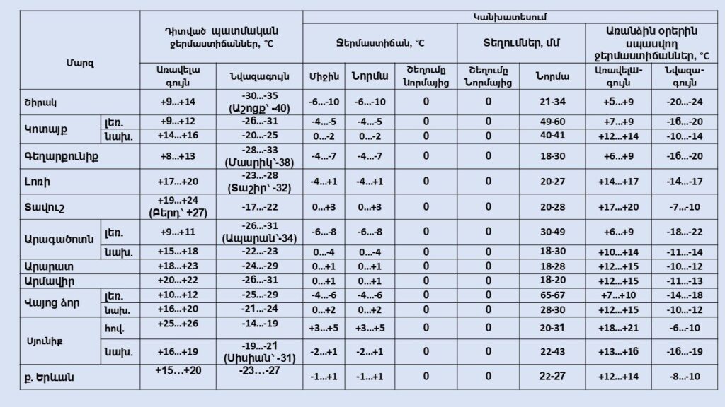 Օդի ամսական միջին ջերմաստիճանը և տեղումների քանակը կանխատեսվում է նորմային մոտ։
