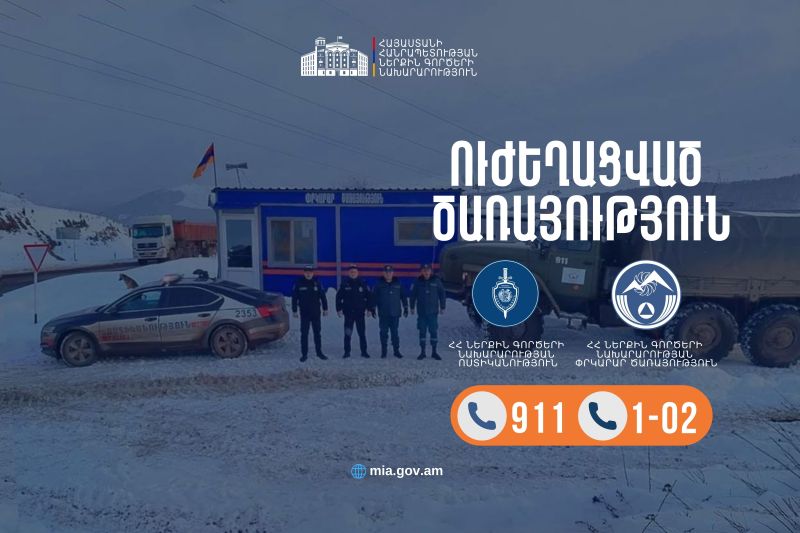 «ՆԳՆ Ոստիկանությունն ու Փրկարար ծառայությունը ճանապարհներին իրականացնում են ուժեղացված ծառայություն՝ հնարավոր խոչընդոտների դեպքում օգնելով մեր քաղաքացիներին և ապահովելով երթևեկության անվտանգությունը։