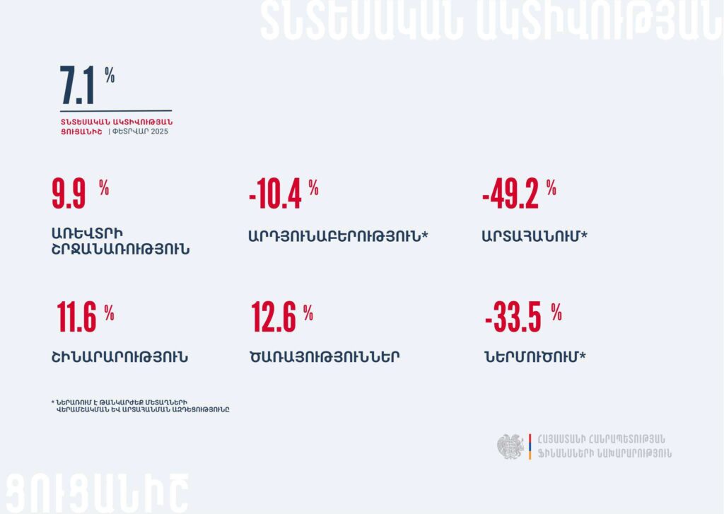 Հայաստանի տնտեսական ակտիվության ցուցանիշն այս տարվա հունվարին, 2024թ․ նույն ամսվա համեմատ․ աճել է 7.1%–ով: