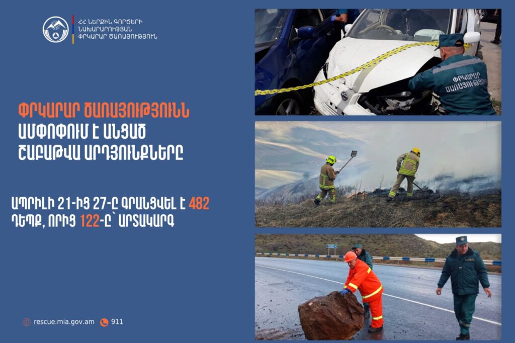 Ապրիլի 21-ից 27-ը ՆԳՆ ՓԾ ճգնաժամային կառավարման ազգային կենտրոնում գրանցվել է 482 դեպք, որից 122-ը՝ արտակարգ: