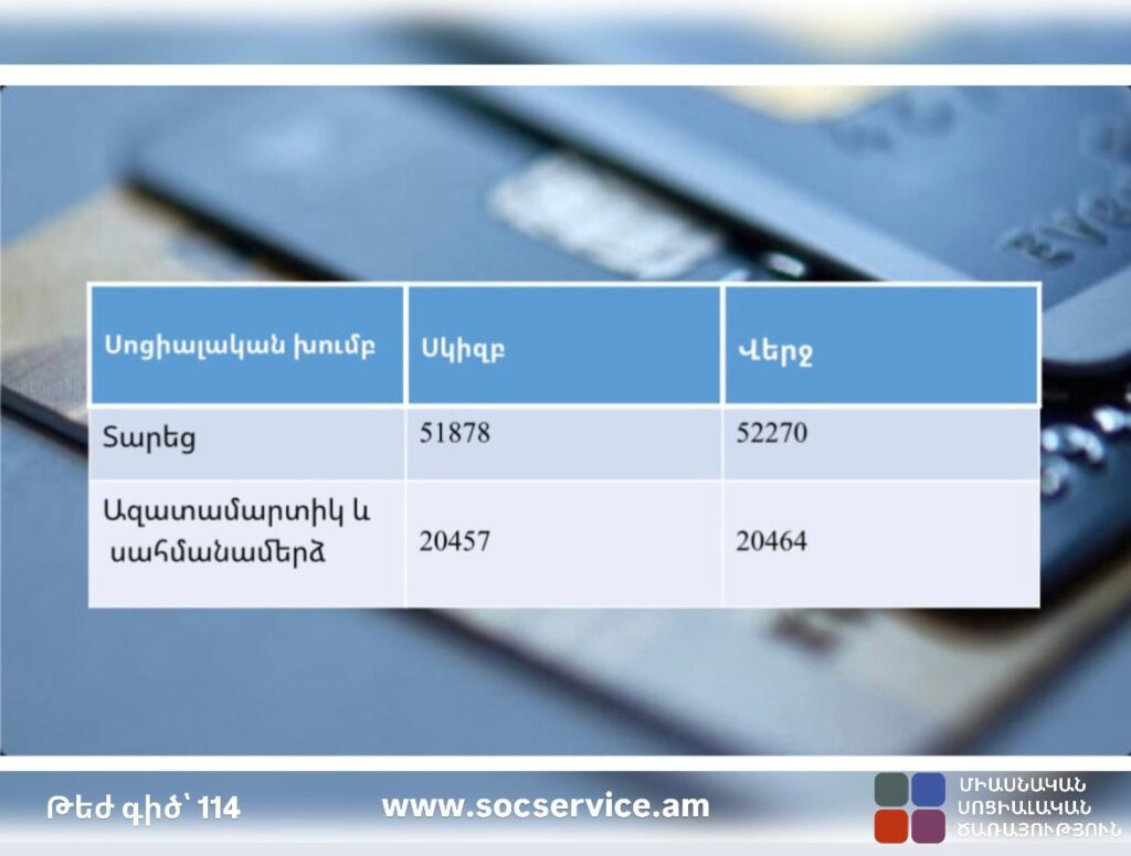 Միասնական սոցիալական ծառայությունը տեղեկացնում է, որ նախկին ԽՍՀՄ խնայբանկի ՀԽՍՀ հանրապետական բանկում մինչև 1993 թվականի հունիսի 10-ը ներդրված դրամական ավանդների դիմաց փոխհատուցման 2025 թվականի ապրիլ ամսվա վճարման ցուցակներում ներառված հերթական համարների միջակայքերը տրամադրվում են ստորև ներկայացված աղյուսակի տեսքով: