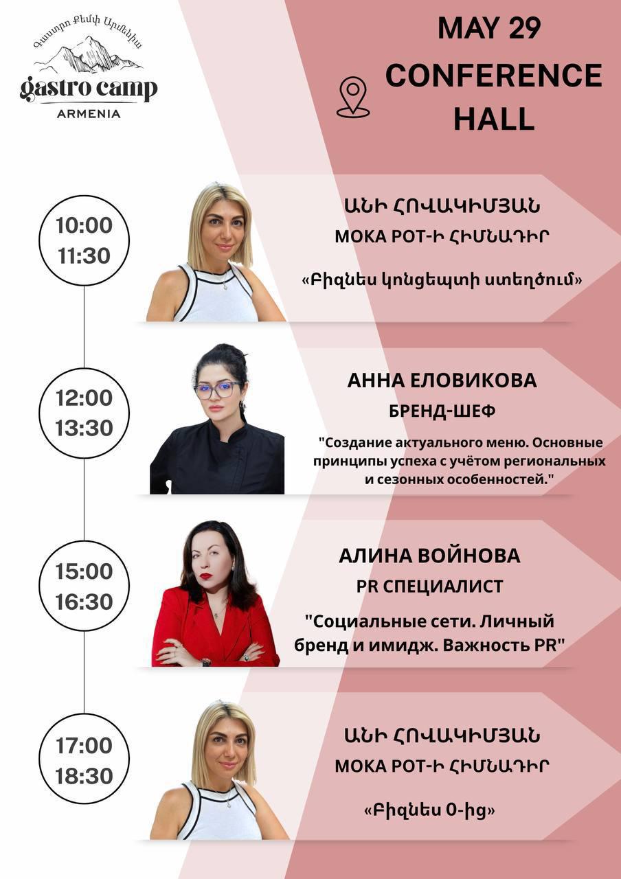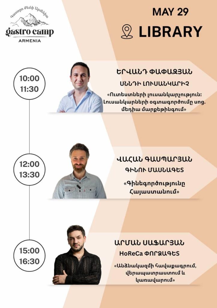 Ինչպե՞ս աշխատել անձնակազմի հետ, ինչպե՞ս հիմնել և կառավարել ռեստորան, որո՞նք են հյուրանոցային սպասարկան միջազգային ստանդարտները, ինչպե՞ս մատուցել գինի, ինչպե՞ս լուսանկարել սնունդը և վարել սոցիալական կայքերը: Այս ամենի մասին կխոսեն ոլորտի լավագույն մասնագետները հենց Կապանում: Ուշագրավ է, որ մշակույթի կենտրոնի ներքին բակում հավաքվելու է պրոֆեսիոնալ խոհանոց, որտեղ հրավիրյալ շեֆ-խոհարարները կունենան վարպետաց դասեր: Սա գերազանց հնարավորություն է ոչ միայն ոլորտի աշխատակիցների համար, այլև բոլոր նրանց համար, ովքեր սիրում են գեղեցիկը և որակյալը հյուրընկալության ոլորտում: