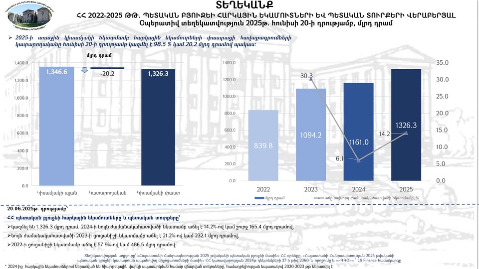 Ընթացիկ տարվա հունիսի 20-ի դրությամբ՝ ՀՀ պետական բյուջեի հարկային եկամուտները և պետական տուրքերը կազմել են 1,326.3 մլրդ դրամ, որը 2024թ. նույն ժամանակահատվածի համեմատ աճել է 14.2%-ով կամ 165.4 մլրդ դրամով:
