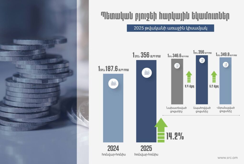 2025 թվականի առաջին կիսամյակի ընթացքում ՀՀ պետական եկամուտների կոմիտեն ապահովել է 1 տրլն 356.0 մլրդ դրամ հարկային եկամուտներ և պետական տուրքեր, ինչը 2025 թվականի պետական բյուջեի համամասնություններով առաջին կիսամյակի համար նախատեսված ցուցանիշից` 1 տրլն 346.6 մլրդ դրամից, ավելի է 9.4 մլրդ դրամով կամ 0.7%-ով, իսկ վերանայված ցուցանիշից` 1 տրլն 349.8 մլրդ դրամից, ավելի է 6.2 մլրդ դրամով կամ 0.5%-ով: